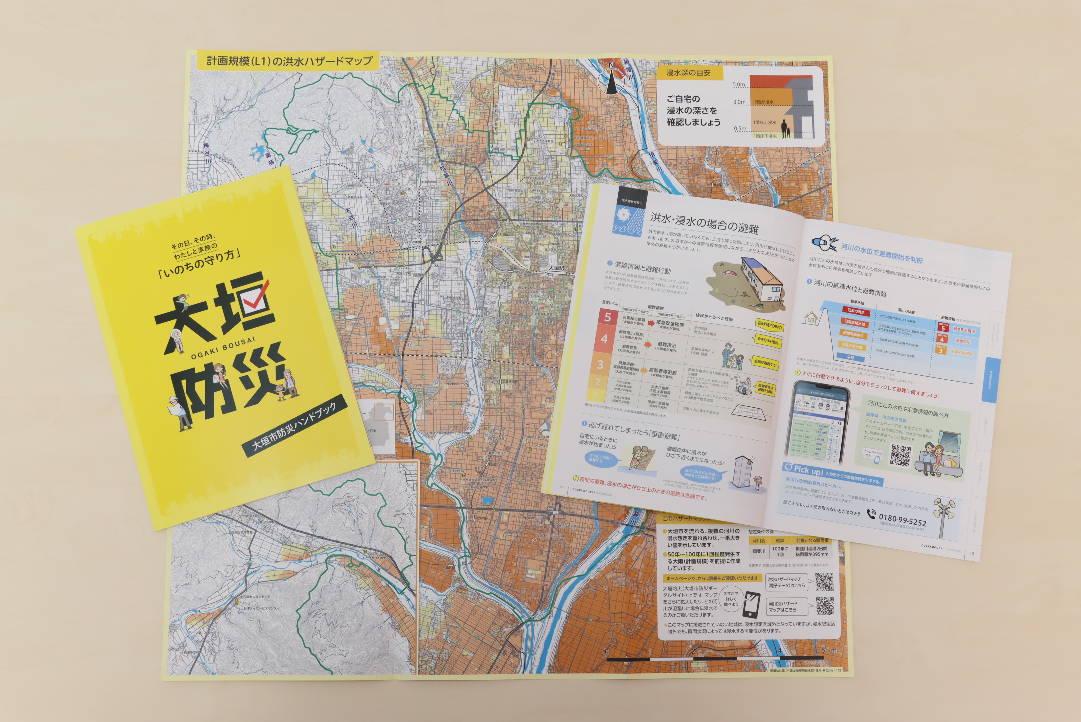 災害に対する事前の備えや発災時の対処方法など、いざというときに役立つ情報をまとめた、防災情報冊子「大垣市防災ハンドブック」を作成しました。災害や防災に関する知識を高めることに加え、チェックし必要事項を書き込むことで、日ごろの防災に関する対策を見直すことができます。ぜひ、本書を読み進めながら、「わが家の防災メモ」にまとめていき、ご家庭にあった防災対策を進めましょう。インターネット上でご覧いただけるほか、冊子をご希望の人には、危機管理室や各地区センターなどで配布しています。洪水ハザードマップとあわせて、ぜひご一読ください。